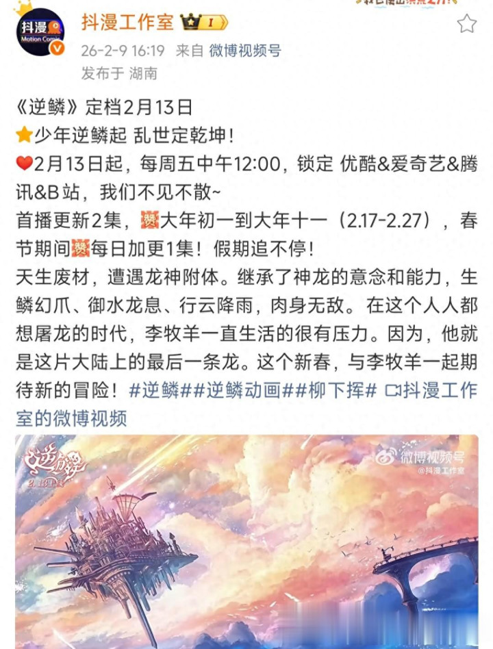 “少年逆鳞起 浊世定乾坤!2月13日起,每周五中午12:00,锁定优酷&爱奇艺&腾讯&B站,咱们不见不散~” 动态漫《逆鳞》改编柳下挥所写的同名演义,抖漫制作,