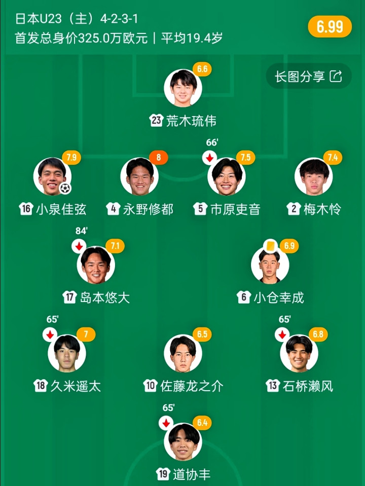 而日本U23方面,本届比赛派出的是以2005年龄段为主的队员,除了一些在J联赛效力的队员以外,队中大部分球员的身价都不是很高,且多名大学生球员因为没有参加职业联赛,球员本身目前还没有转会身价。