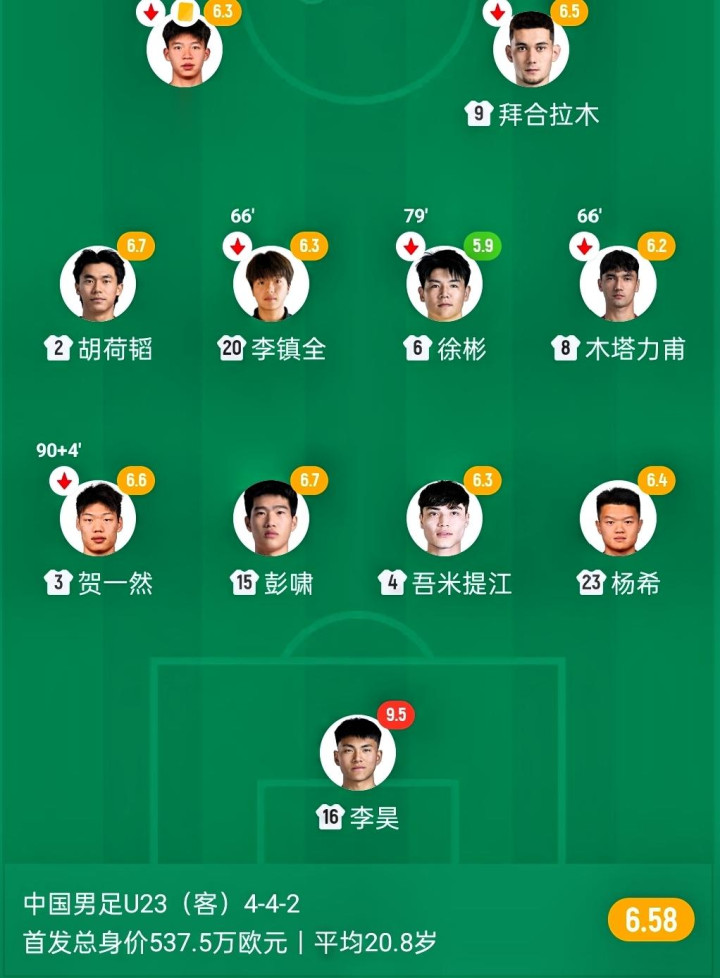 如果以首发阵容的球员身价来来看,在对阵乌兹别克斯坦U23的比赛中,中国U23的首发11人身价约537.5万欧。其中王钰栋和胡荷韬是队中身价较高的队员,王钰栋的个人身价为150万欧,而胡荷韬的身价虽然略有下降,但仍有70万欧的水平。