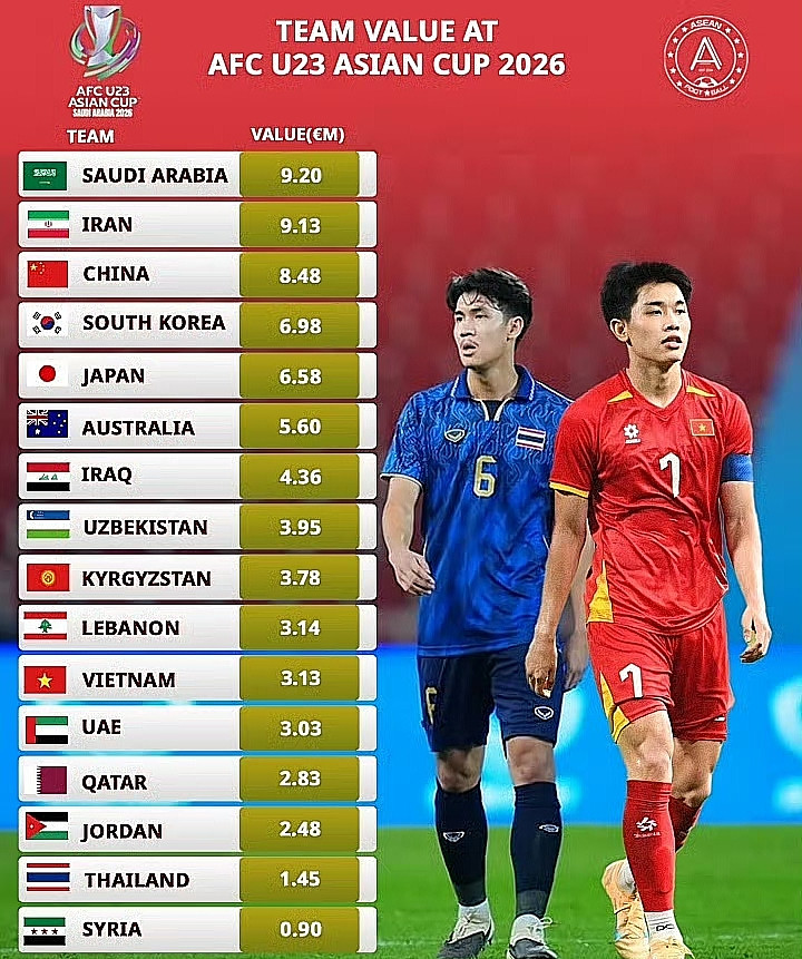 在参加本届U23亚洲杯的所有16支球队中,U23国足的球员总身价一共848万欧,排在所有球队的第3位。而在晋级到8强队球队中,中国U23则是总身价排名最高的球队。