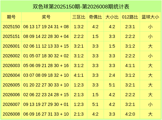 红球大小比为3:3,奇偶比为4:2,012路比为4:2:0,蓝球开出大数。 最近10期奖号属性统计分析