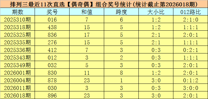 排列三上期奖号为896,开出奇偶类型为【偶奇偶】,前10次【偶奇偶】类型奖号分别开出:016、438、836、276、412、012、032、830、878、030;