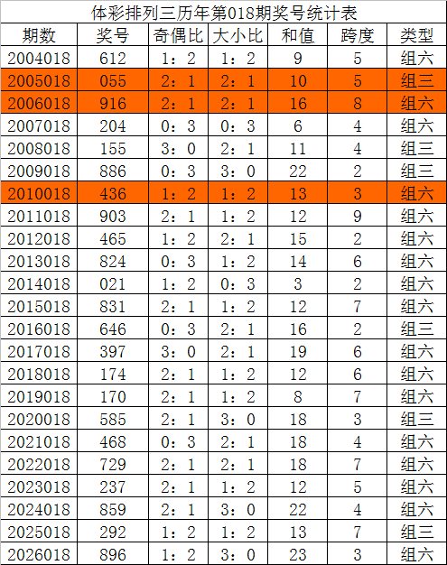 排列三第2026018期奖号为896,奇偶比为1:2,大小比为3:0,和值为23,跨度为3。