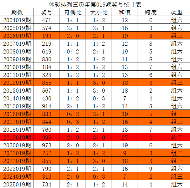 体彩排列三历年第019期开出奖号分别为:471、574、199、219、649、830、184、328、855、567、430、914、883、844、760、999、973、252、855、790、313、734。统计详见下表: