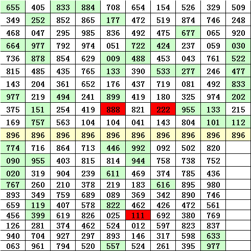 排列三直选号码896开出之后,其下期号码的特点为: 1.号码012路比为10:10:7,2路号码走冷,本期号码012路比参考1:1:1。 2.号码大小比为8:19,其中小 号明显大热,本期预计小 号继续开出。 3.号码奇偶比为11:16,其中偶数号码走势较热,本期预计偶数号码继续热出。 4.下期奖号有3期没有出现重号,有6期出现了重号,本期放弃重号出现的可能。 5.下期组三出现3次,组六出现6次,本期看好开出组六号码。