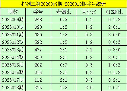 开奖回顾:排列三第2026018期奖号为:896,其奇偶比为1:2,大小比为3:0,奖号012路比为2:0:1。