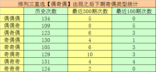 排列三第2026018期奖号为896,直选奇偶分布为:偶奇偶,该奇偶分布历史上共出现了986次,前100期出现20次。
