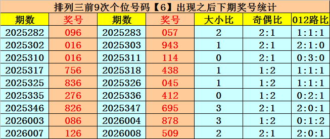 个位号码:上期奖号为大号、偶数、0路号码:6,历史上个位号码6共开出741期,前一次出现在第2026007期,上期遗漏10期再出。 个位前9次开出号码6时,该位下期奖号分别为:7-3-4-8-5-2-5-8-9,其中号码个数012路比是2:2:5,奇偶比是5:4,大小比是6:3。 本期个位注意开出1路奖号,胆码看好4。