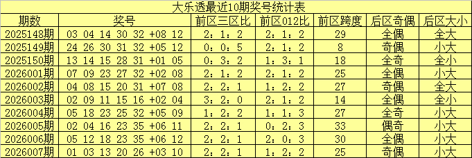 大乐透第2026007期奖号开出:01 03 13 20 26 +03 10。其中前区三区比为2:2:1,012路比为1:2:2,后区开出一大一小、一奇一偶奖号。