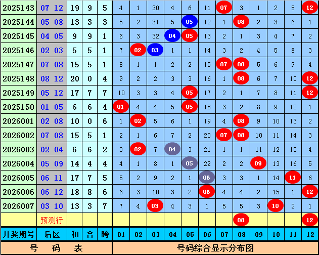 后区分析:上期后区开出号码03和10,最近10期后区奖号奇偶比为8:12,大小比为10:10,本期后区看好号码03、08、09、11、12,后区单挑两码08、12。