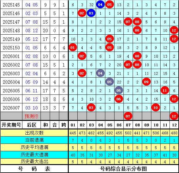 和尾大小:最近10期和尾大小比为2:8,小 号和尾表现相对较热,小 号和尾连续开出了5期,短期内不会转冷,本期继续关注小 号和尾。 和尾质合:最近10期和尾质合比为7:3,合数和尾表现相对较冷,当期遗漏2期,本期适当关注合数和尾回补。 和值跨度:上期和值开出63,对比第2026006期和值下降了30个点位,本期预计和值在大号区域热出,看好出现在90周围。