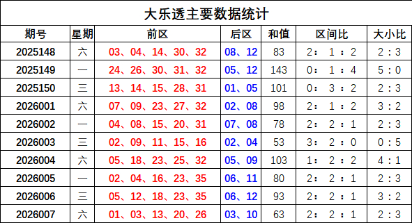 上期回顾:大乐透上期奖号为:前区01 03 13 20 26,后区03 10,前区奖号和值为63,区间比2:2:1,大小比为2:3,