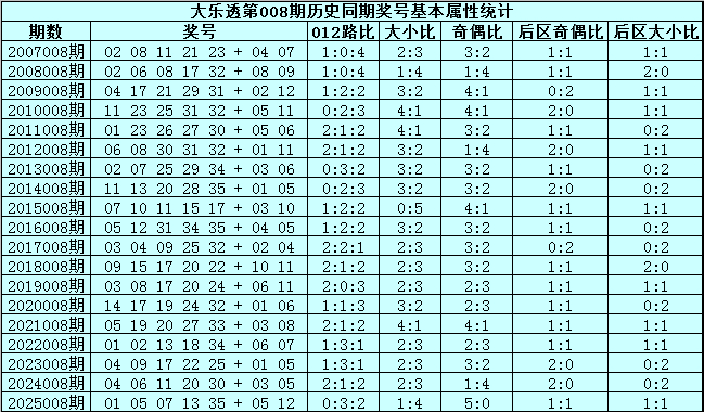 大乐透第2026008期历史同期号码分析: 前区奇偶比推荐:第008期历史同期开奖中,号码奇偶比总比例开出18:77,其中奇偶比0:5→0次、1:4→4次、2:3→3次、3:2→4次、4:1→2次、5:0→5次,奇数出现较少,本期注意回补,参考奇偶比3:2。 前区012路比推荐:第008期历史同期开奖中,奖号012路比总比例为22:30:43,其中0路号码轮空4期,1路号码轮空3期,2路号码轮空0期,开云本期注意1路和2路号热出,看好0路号走冷,关注012路比1:2:2。 前区大小比推荐:第008期历史同期奖号中,号码大小比总比例为46:49,其中大小比0:5→1次、1:4→2次、2:3→7次、3:2→6次、4:1→3次、5:0→0次,大号开出个数较少,本期看好大号回补,看好大小比3:2。