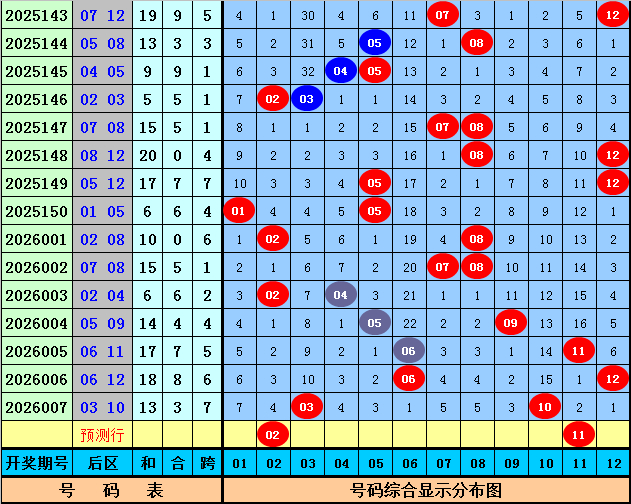 后区判断:后区第008期历史同期奖号大小比总比例为2:17,大号出现较少,本期看好大号回补,注意一大一小,两码参考02、11。