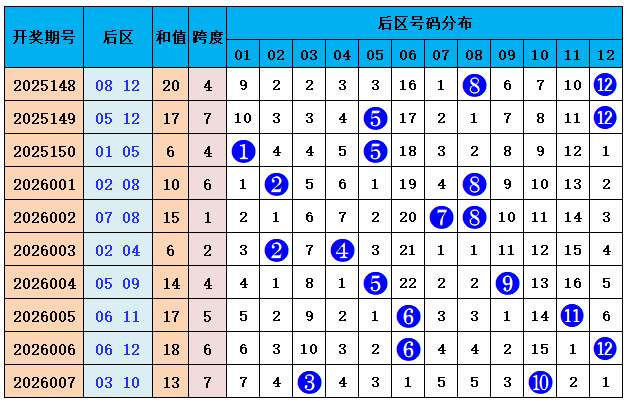 上期回顾:大乐透第2026007期奖号:前区01、03、13、20、26,后区03、10,前区奖号和值为63,012路比为1:2:2,后区开出小大组合03、10