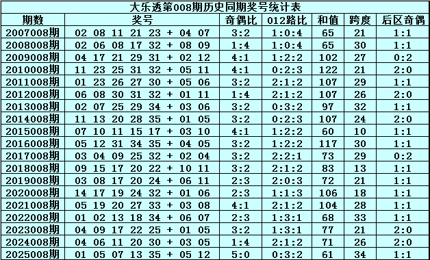 后区分析:在第008期历史同期开奖中,后区奖号全奇出现5次,全偶出现2次,一奇一偶出现12次,今年第008期后区预计出现一奇一偶组合,看好两码03和12。