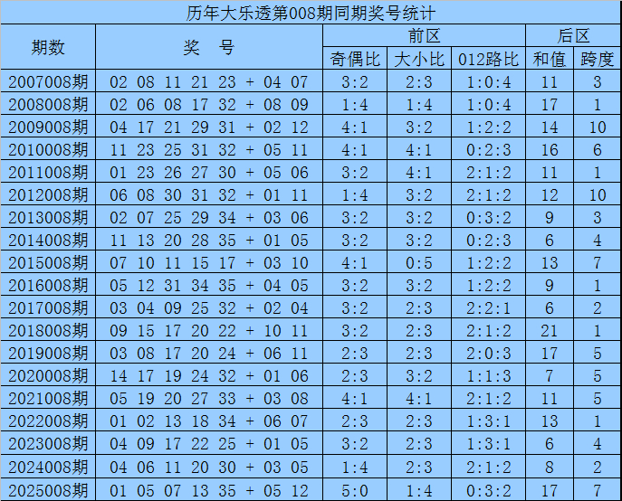 袁军师体彩大乐透第2026008期历史同期奖号分析: