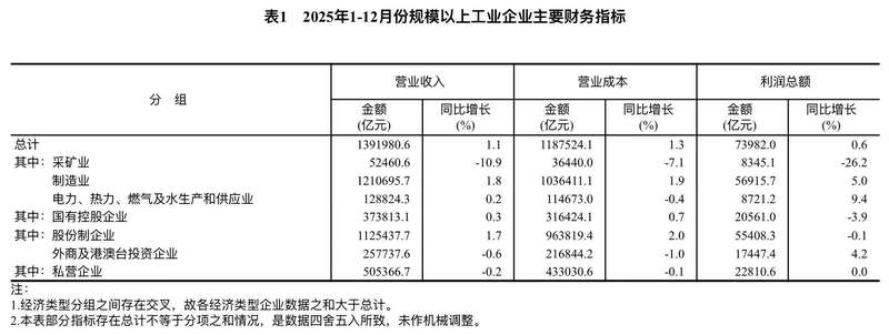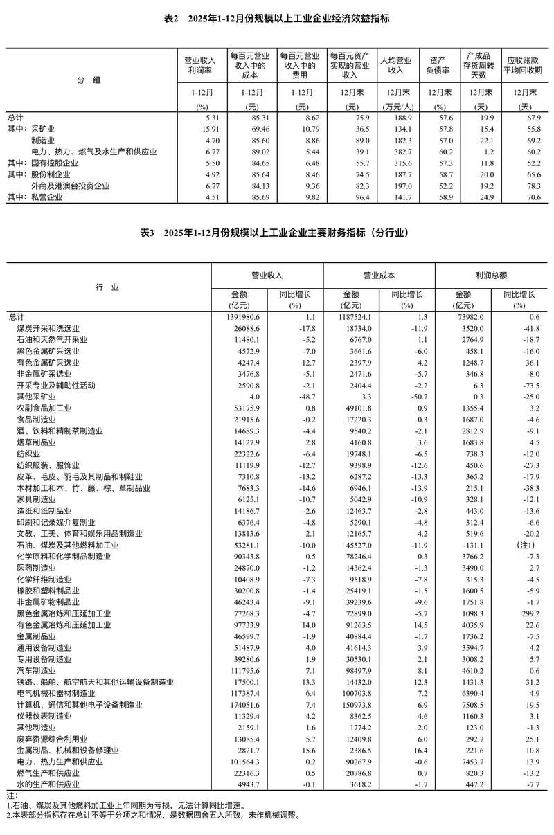 新京报讯 据国家统计局消息,2025年,全国规模以上工业企业实现利润总额73982.0亿元,比上年增长0.6%。 2025年,规模以上工业企业中,国有控股企业实现利润总额20561.0亿元,比上年下降3.9%;股份制企业实现利润总额55408.3亿元,下降0.1%;外商及港澳台投资企业实现利润总额17447.4亿元,增长4.2%;私营企业实现利润总额22810.6亿元,与上年持平。 2025年,采矿业实现利润总额8345.1亿元,比上年下降26.2%;制造业实现利润总额56915.7亿元,增长5.0%;电力、热力、燃气及水生产和供应业实现利润总额8721.2亿元,增长9.4%。 2025年,主要行业利润情况如下:黑色金属冶炼和压延加工业利润比上年增长3.0倍,有色金属冶炼和压延加工业增长22.6%,计算机、通信和其他电子设备制造业增长19.5%,电力、热力生产和供应业增长13.9%,专用设备制造业增长5.7%,电气机械和器材制造业增长4.9%,通用设备制造业增长4.2%,农副食品加工业增长3.2%,汽车制造业增长0.6%,石油、煤炭及其他燃料加工业比上年减亏,非金属矿物制品业下降1.7%,化学原料和化学制品制造业下降7.3%,纺织业下降12.0%,石油和天然气开采业下降18.7%,煤炭开采和洗选业下降41.8%。 2025年,规模以上工业企业实现营业收入139.20万亿元,比上年增长1.1%;发生营业成本118.75万亿元,增长1.3%;营业收入利润率为5.31%,比上年下降0.03个百分点。 2025年末,规模以上工业企业资产总计188.41万亿元,比上年末增长4.3%;负债合计108.58万亿元,增长4.2%;所有者权益合计79.82万亿元,增长4.5%;资产负债率为57.6%,比上年末下降0.1个百分点。 2025年末,规模以上工业企业应收账款27.43万亿元,比上年末增长4.7%;产成品存货6.73万亿元,增长3.9%。 2025年,规模以上工业企业每百元营业收入中的成本为85.31元,比上年增加0.16元;每百元营业收入中的费用为8.62元,比上年减少0.02元。 2025年末,规模以上工业企业每百元资产实现的营业收入为75.9元,比上年末减少2.7元;人均营业收入为188.9万元,比上年末增加5.5万元;产成品存货周转天数为19.9天,比上年末增加0.6天;应收账款平均回收期为67.9天,比上年末增加3.6天。 12月份,规模以上工业企业利润同比增长5.3%。