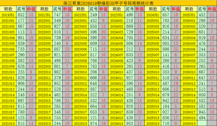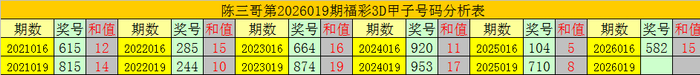 第一、本期奖号可参考第2026016期奖号582。 第2021年-第2025年的第016期奖号分别为:615、285、664、920、104,第2021年-2025年的第019期奖号分别为:815、244、874、953、710。其中: 第2021016期奖号:615与第2021019期奖号815有同号:1、5; 第2022016期奖号:285与第2022019期奖号244有同号:2; 第2023016期奖号:664与第2023019期奖号874有同号:4; {jz:field.toptypename/}第2024016期奖号:920与第2024019期奖号953有同号:9; 第2025016期奖号:104与第2025019期奖号710有同号:0、1; 则,第2026019期奖号可以参考第2026016期奖号:582。