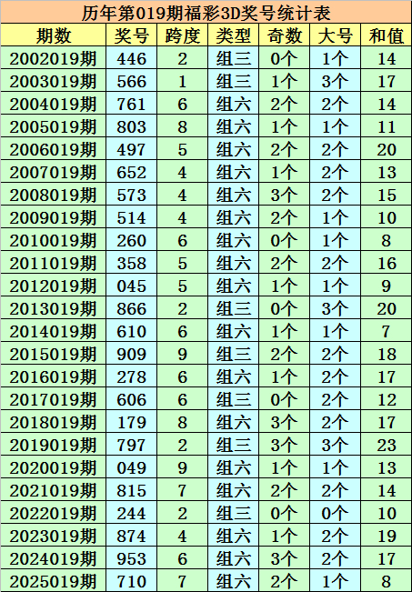 历年第019期福彩3D同期奖号为:446 - 566 - 761 - 803 - 497 - 652 - 573 - 514 - 260 - 358 - 045 - 866 - 610 - 909 - 278 - 606 - 179 - 797 - 049 - 815 - 244 - 874 - 953 - 710。
