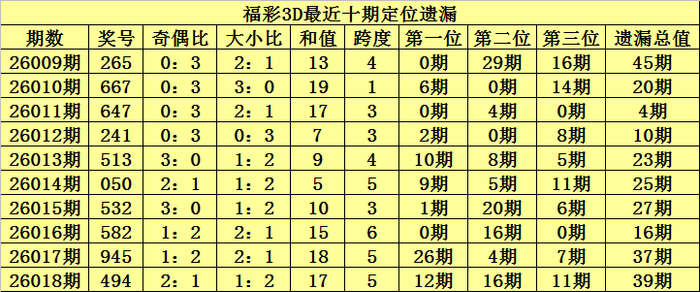 开奖回顾:福彩3D第2026018期奖号:494,百位号码遗漏12期、十位号码遗漏16期、个位号码遗漏11期,遗漏总值为39期。