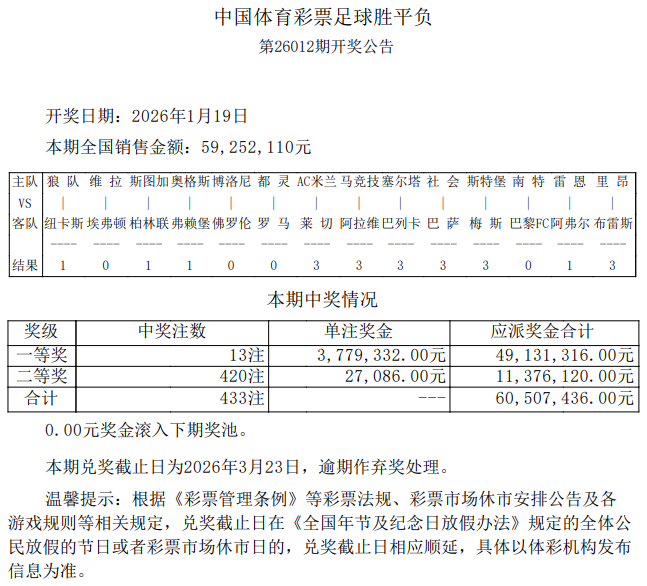 北京时间1月19日,胜负彩第26012期开奖结果揭晓。本期足彩头奖共开出13注,单注奖金3,779,332元,2258万滚存被清空;二等奖开出420注27,086元;任九开1276注11,135元。本期十四场销量为59,252,110元,任九总投注额为22,202,152元。 {jz:field.toptypename/} 彩果方面,本期非首赔赛果多达8场,开云中国app登录入口其中维拉0-1不敌埃弗顿爆5.6倍大冷,巴萨客场1-2负于皇家社会爆4.7倍冷门;此外纽卡、斯图加特、奥格斯堡、雷恩均打出冷平;南特1-2负于巴黎FC,博洛尼亚1-2不敌佛罗伦萨;其余场次,罗马、AC米兰、马竞、塞尔塔、斯特拉斯堡、里昂打出赢球正路。