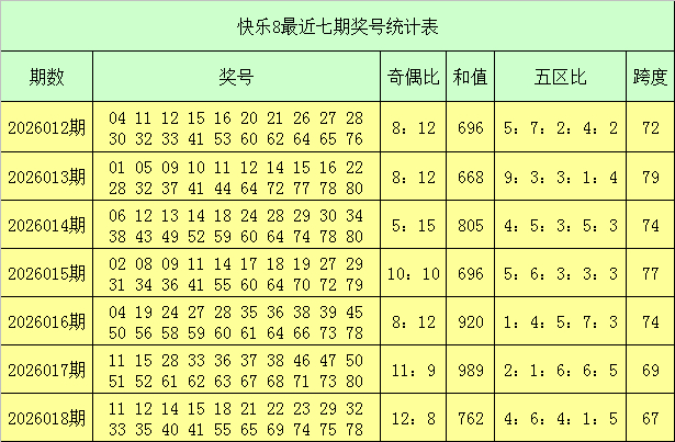 福彩快乐8第2026018期开出奖号:11 12 14 15 18 21 22 23 29 32 33 35 40 41 55 65 69 74 75 78,其中奖号奇偶比为12:8,和值为762,跨度67,五区比为4:6:4:1:5。