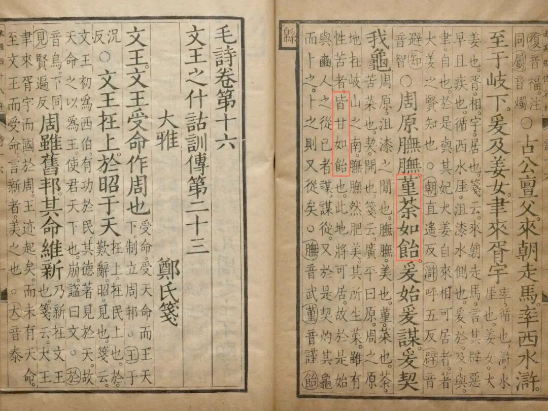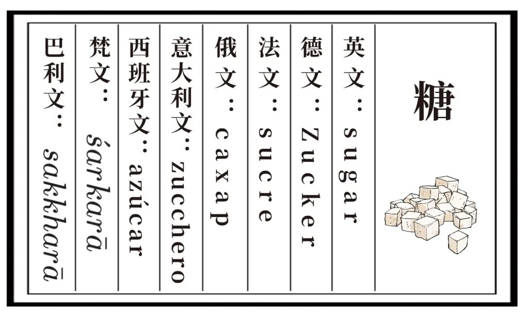 《诗经》中《大雅·文王之什·绵》:“周原膴膴(wǔ),堇(jǐn)荼如饴”。这时的糖被称为“饴”,饴糖用糯米或麦制成,俗称麦芽糖,而非后来的蔗糖。 季羡林先生曾发现,英文里的 Sugar、德文里的 Zucker,根源都在梵文的śarkarā和khandaka,而印度人管白糖叫 Cīni(中国糖)……这说明西方原本没有糖……