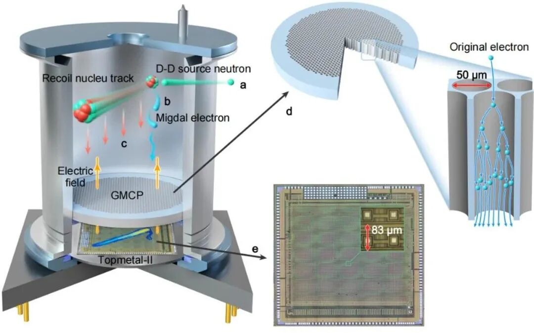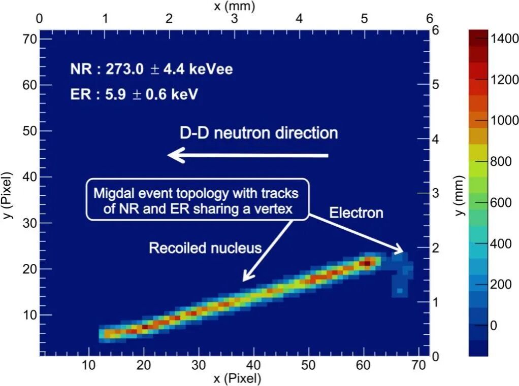 米格达尔效应由苏联物理学家阿尔卡季·米格达尔于1939年提出,描述了原子核反冲时通过电场变化将能量转移给核外电子、形成“共顶点”带电径迹的物理过程。这一效应被认为是突破轻暗物质探测阈值的重要路径,但中性粒子碰撞中的该效应长期缺乏直接实验验证,成为制约相关暗物质探测研究的关键瓶颈。