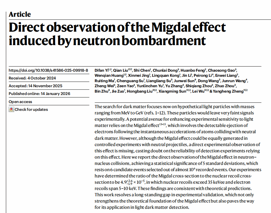 近日,国际顶级学术期刊《自然》发表一项重大物理突破——中国科学院大学领衔联合广西大学、华中师范大学等多所高校科研团队协同攻关,首次成功实现了对苏联科学家于80余年前预言的“米格达尔(Migdal)效应”的直接实验观测。这一成果为轻暗物质探测突破阈值瓶颈提供了关键支撑,实现该突破的核心硬件——像素读出芯片Topmetal-II,由华中师范大学PLAC实验室自主研制。我校为该研究的核心合作单位之一,物理科学与技术学院孙向明教授、王东教授和高超嵩教授参与研究,孙向明为共同通讯作者。