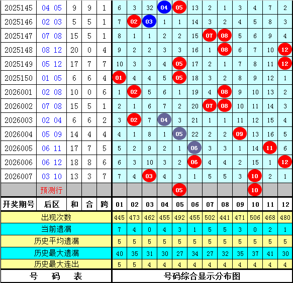 上期回顾:体彩大乐透第2026007期开出号码:01 03 13 20 26 + 03 10,其中前区奖号尾数奇偶比为3:2,大小比为1:4,012路比为4:1:0,大中小比为0:3:2,后区奖号尾数奇偶比为1:1,大小比为0:2。
