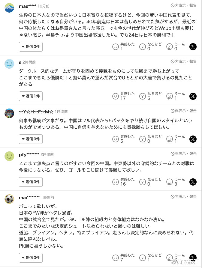 有球迷评论道:“我之前看过那种黑马球队靠着防守,一路跌跌撞撞杀进了决赛,然后在比赛前,全队都显得信心满满,似乎冠军已经唾手可得,结果却被5-0血洗了。” 还有球迷写道:“中国队至今零失球,表现确实很出色。与这样的球队比赛,对日本队也是个很好的锻炼,相信他们一定能攻破对手的球门,赢得最终的冠军!” 也有球迷表示:“作为一个日本人,当然是偏向日本队的,但是看到这支年轻的中国队,不知道为什么有点想给他们加油。大概40年前,日本队还很难和中国队抗衡,这也算是我们的‘老对手’了。感觉这批年轻人成长起来的话,中国队进世界杯也不再是梦了。相比起韩国,我更希望中国队能进世界杯。不过24号的决赛,还是希望日本队获胜!” {jz:field.toptypename/}